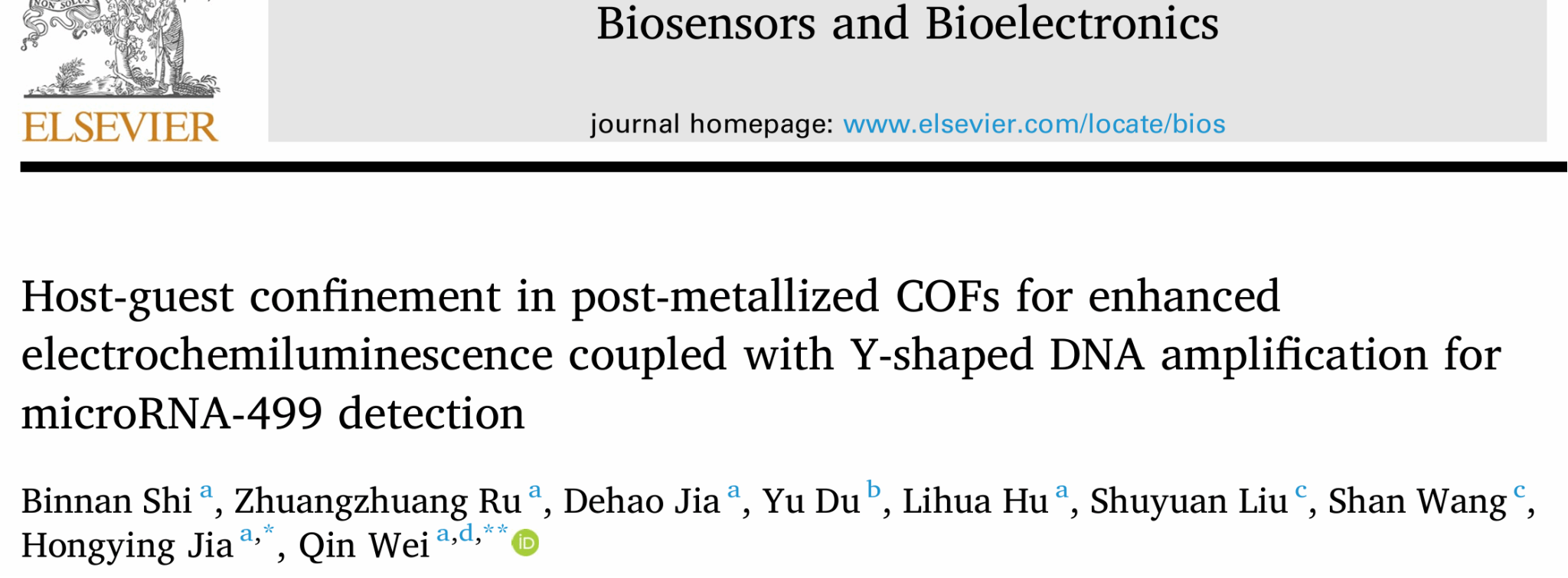 近日,365上市公司官网魏琴课题组在权威期刊《Biosensors and Bioelectronics》上发表了题为“Host-guest confinement in post-metallized COFs for enhanced electrochemiluminescence coupled with Y-shaped DNA amplification for microRNA-499 detection”的研究论文。