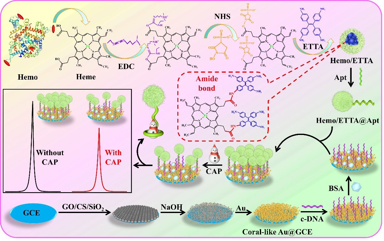 纳米限域策略是一种可解决分散状态下聚集诱导发光(AIE)材料的发光猝灭问题的有效方法。然而,传统的合成载体大多使用了过量的金属离子,这在生物安全性方面存在显著缺陷。作为一种天然的血液蛋白,血红蛋白(Hemo)具有优异的生物相容性和生物安全性。同时它还含有Fe2+,可用作电化学发光(ECL)过程的催化剂。因此,济南大学魏琴教授团队,魏琴、范大伟、冯锐作为通讯作者,提出了一种基于血红蛋白纳米限域四-(4-氨基苯)乙烯(ETTA)的新型自催化聚集诱导电子发光(AIECL)探针,它克服了传统合成载体的高细胞毒性。相关成果以“Nanoconfinement Synergistic Self-Catalytic Coenhanced Electrochemiluminescence Sensors for Chloramphenicol Detection”为题发表在分析化学领域国际顶级期刊《Analytical Chemistry》上。在这项工作中,血红蛋白被用作双功能纳米封装剂,具有纳米限域载体和共反应剂促进剂的双重作用。其独特的四元结构不仅为纳米限制提供了稳定的自组装环境,而且有效地抑制了ETTA在溶液中的自由扩散,从而诱导了ETTA的AIECL。重要的是,血红蛋白中的Fe2+可以作为自催化剂,缩短电子转移路径,大幅提高发光体的电化学发光性能。此外,珊瑚状的金结构也可以有效提高电极的导电性和负载能力。构建出的传感器可以实现桃花虾和白蛤样品中氯霉素的精准检测。这项工作为构建绿色高效的生物安全探针提供了新的见解,在食品安全检测领域显示出重要的应用潜力。