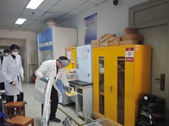 基础化学实验中心张卫民老师迅速封闭实验室,防止污染扩散,同时认真清点实验室人员人数,确保每一个人都安全撤离。赵阳老师向于龙泉书记汇报情况后,于书记通知按应急预案行动,保障人员安全,减轻对实验室资产和设备的损害,并展开救援。