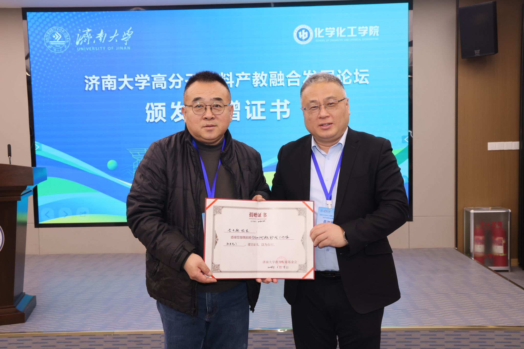 10日下午,济南大学党委常委、副校长黄加栋出席“济南大学高分子材料产教融合发展论坛暨山东省先进高分子材料现代产业学院建设论坛”,并为1988届校友李木森颁发教学设备捐赠证书。